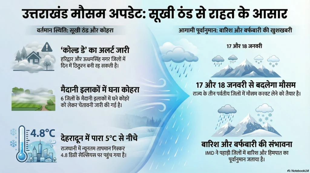 उत्तराखंड में सूखी ठंड का प्रकोप जारी है। मौसम विभाग ने मंगलवार को हरिद्वार और ऊधमसिंह नगर जिलों में कोल्ड डे (शीत दिवस) की स्थिति रहने की संभावना जताई है। इन जिलों में दिन में धूप न निकलने से ठिठुरन बनी रह सकती है। राज्य के छह जिलों के मैदानी इलाकों में घने कोहरे को लेकर चेतावनी जारी की गई है। उधर, प्रदेश में कड़ाके की ठंड के बीच मौसम एक बार फिर करवट लेने को तैयार है। मौसम विभाग ने 17 और 18 जनवरी को राज्य के तीन पर्वतीय जिलों में बारिश और बर्फबारी की संभावना जताई है। मौसम निदेशक डॉ. सीएस तोमर ने बताया कि राज्य के सभी जनपदों में मौसम शुष्क रहेगा। हरिद्वार और ऊधमसिंह नगर के साथ-साथ नैनीताल, चंपावत, पौड़ी और देहरादून के मैदानी क्षेत्रों में कहीं-कहीं घना कोहरा छाने के आसार हैं। पर्वतीय क्षेत्रों में पाला पड़ने की चेतावनी दी गई है, जिससे तापमान में गिरावट की संभावना है।